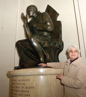 Do dziś pamiętam ks. Wojtyłę – młodego kapłana spacerującego z brewiarzem tam i z powrotem w bocznej nawie i modlącego się w skupieniu. Wyglądał na poważnego i surowego. Miał donośny głos, który w nas, młodych, wzbudzał szacunek, a nawet swego rodzaju strach – głównie z powodu obcego akcentu. Ksiądz Wojtyła był bardzo przystojny, a przy tym miał niezwykle przenikliwy wzrok: zdawało się nam, że kiedy na nas patrzył, zaglądał bezpośrednio do duszy. Do dziś nie mogę zapomnieć jego oczu, mocno skupionych na osobie, z którą rozmawiał… Teraz w zachowaniu tego w pamięci pomaga mi stojący w naszym kościele pomnik, którego autor bardzo realistycznie oddał ten przenikliwy wzrok młodego polskiego kapłana.